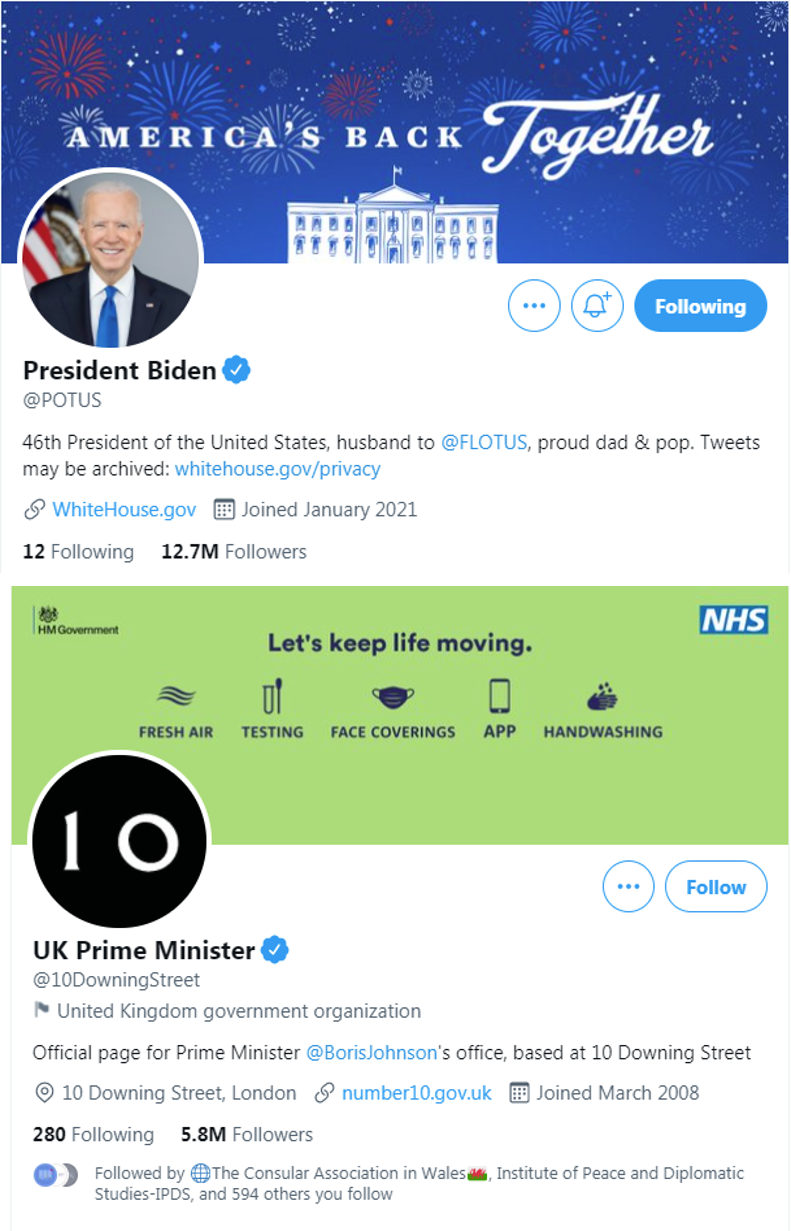 In my analysis, I found that leaders’ profile pictures on Twitter could be grouped into five categories. The first category included leaders who use profile pictures to send Covid-related political messages. One prime example is US President Biden whose picture includes the statement “America’s Back Together” while 4th of July fireworks light the sky. The political message here refers to the Biden administration’s success in vaccinating, and gradually reopening America. Another example came from the UK Prime Minister’s Twitter account where the profile picture is used to advance the UK government’s new policy of ‘living with Covid’ and easing public restrictions. Living with Covid includes enjoying free air, being tested in case of symptoms, using masks and regularly washing hands.