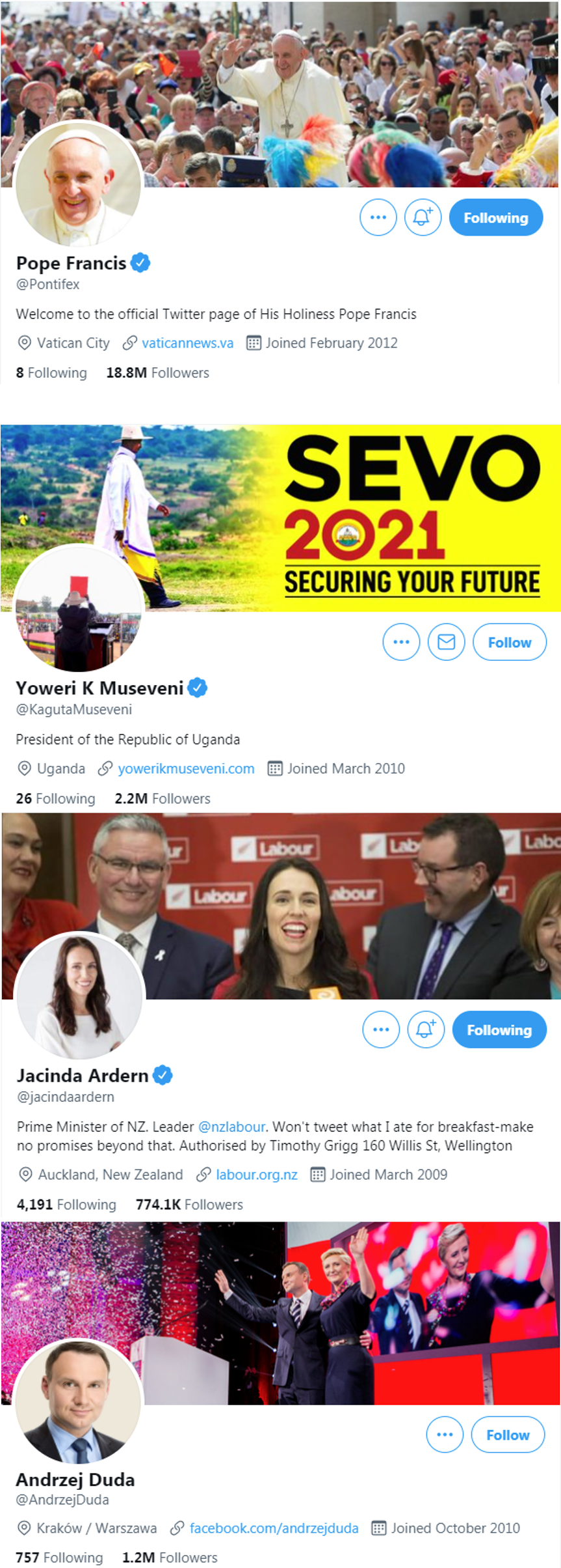 A fourth category, which was also identified in 2016, included political branding. In these instances, leaders use profile pictures to shape their political persona. Some profile pictures include images from election victories. One notable example is Poland’s leader. In other pictures, national leaders are depicted during party functions. Such is the case with New Zealand’s Jacinda Arden, seen optimistic and smiling with the logo of the Labor party behind her. Arden herself is surrounded by other political figures yet she is at center stage. Uganda’s leader is depicted as walking across the country promoting his political platform while Pope Francis is surrounded by adoring crowds shaping his image as the popular Pope.