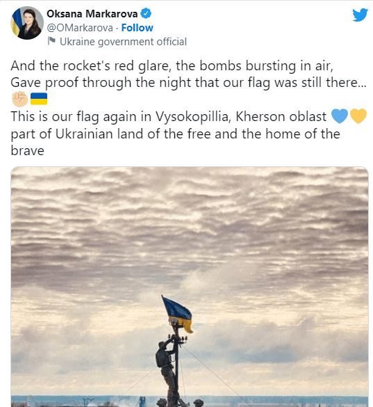 Yet Ukraine’s Ambassador to the US has been practicing tailored communications. Many of the tweets she had published in recent months are tailored to the American public. The Ambassador’s tailoring takes three forms. First, she invokes American symbols and American history. Such is the case with the first tweet below in which the American anthem is used to draw attention to Ukraine’s recent counter-offensive. In the second tweet the Ambassador celebrates the 235th anniversary of the American constitution, while adding that what binds the US and Ukraine are norms and values, namely the protection of freedom and democracy in the face of tyranny.