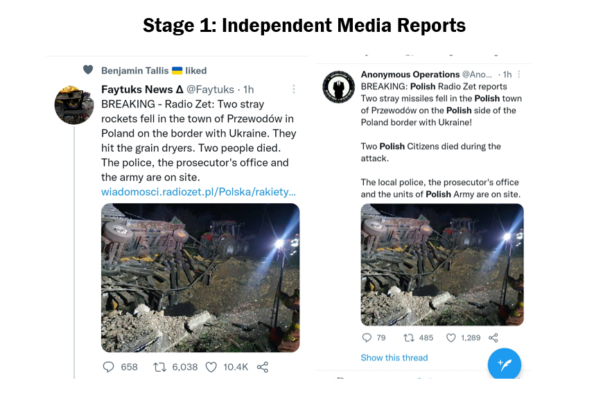 In this post I analyze the timeline of Real Time Diplomacy as it unfolded following the death of two Poles by the aforementioned rockets. Specifically, I segment Real Time Diplomacy into 9 stages. The first stage was akin to that observed by Seib in 2012. At around 8 in the evening, Tel-Aviv time, independent media outlets and citizen journalists began reporting on possible explosions in Poland caused by Russian rockets. Within a few minutes, more detailed tweets surfaced. These included the location of the explosion, its likely source and the outcome- the death of two Polish citizens. 45 minutes later, traditional media sources such as Sky News and the Associated Press published initial tweets confirming that Russian missiles had killed two Poles “according to intelligence sources”. These tweets were quite brief, which is not surprising as traditional media outlets require some time to gather and analyze facts and information. These two initial stages may be seen below.