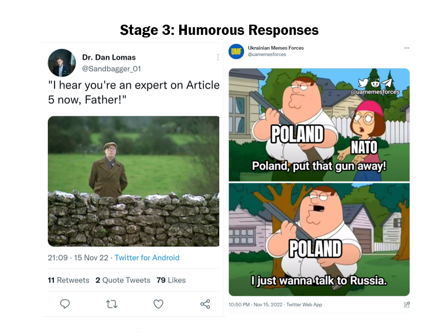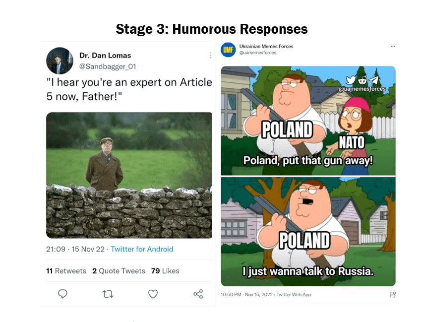 One hour after independent news sources first mentioned the attack, GIFs and Memes were already spreading online. A Meme published by the account ‘Ukrainian Memes Forces’ had already accumulated hundreds of likes. True to the new dynamics of Twitter, as soon as GIFs and Memes were gaining traction, leaders began to tweet messages of condolence and outrage. These short tweets all included similar messages- a condemnation of the possible attack, solidarity with Poland and the promise that leaders would consult with their peers in NATO. Stages 3 and 4 are shown below.