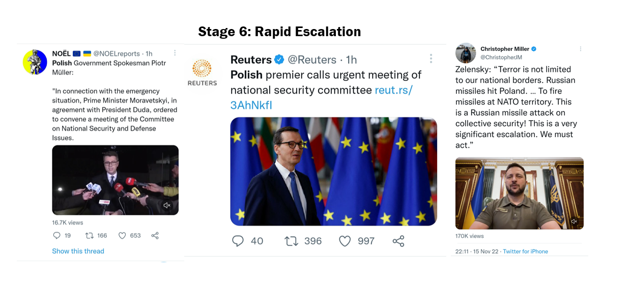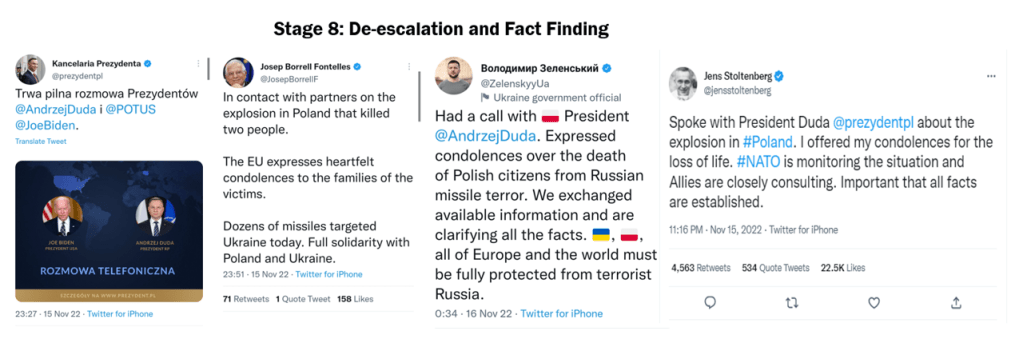 It took nearly another hour before initial diplomatic responses were published on Twitter. While this might seem slow, one should keep in mind that diplomats reacted within two hours to an ongoing event which could have triggered a direct military confrontation between Russia and NATO given that Poland is a NATO member state. The first MFAs to comment on the event were Russia, whose MFA published an urgent tweet denying any rocket fire at Poland. The Polish MFA re-tweeted a message that Polish leaders were speaking on the phone with Ukrainian President Zelenskyy. The next stage, the most dangerous in terms of crisis escalation, came at about 11 Tel Aviv Time as news reports indicated that the Polish government was meeting for “emergency consultations”, while journalists quoted Zelenskyy’s call to immediately retaliate against the Russian attack. It was at this moment that the hashtag WWIII began to trend globally. Stages 5 and 6 can be seen below.