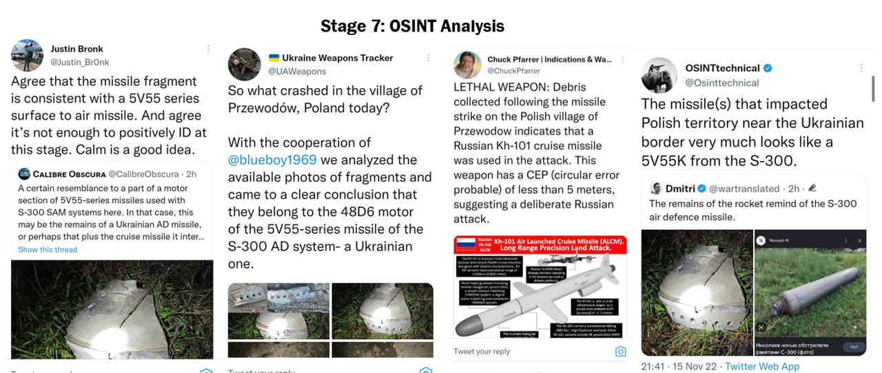 The next stage was dominated by OSINT experts. Within three hours of the initial attack, OSINT Twitter accounts had already published an image of the rocket that hit Poland; analyzed its likely source and trajectory; surmised exactly what kind of missile was used and by whom. Some concluded that the rocket which hit Poland was actually fired by Ukraine and was meant to intercept a Russian missile. Others concluded that the missile was Russian origin, but was aimed at Ukraine not Poland while still others argued that it was a Russian missile “obviously” aimed at Poland. These tweets can be seen below.