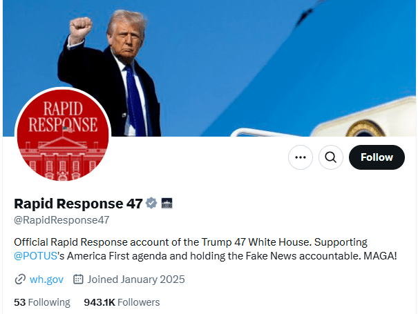 However, a closer analysis of this account reveals that its main purpose is to rapidly publish information praising President Trump and attacking his opponents. Notably, although this is an official account associated with the White House, its biography is decidedly unofficial and reads “Official Rapid Response account of the Trump 47 White House. Supporting @POTUS‘s America First agenda and holding the Fake News accountable. MAGA!”